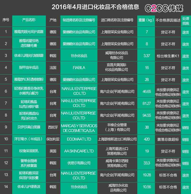 6月1日,質檢總局發(fā)布了2016年4月進口食品化妝品不合格信息,共237批,其中不合格化妝品占14批,涉及雅蔻亮眼光采護底霜、貝伊莎美白面膜等產品,產地包括德國、韓國、法國等。
